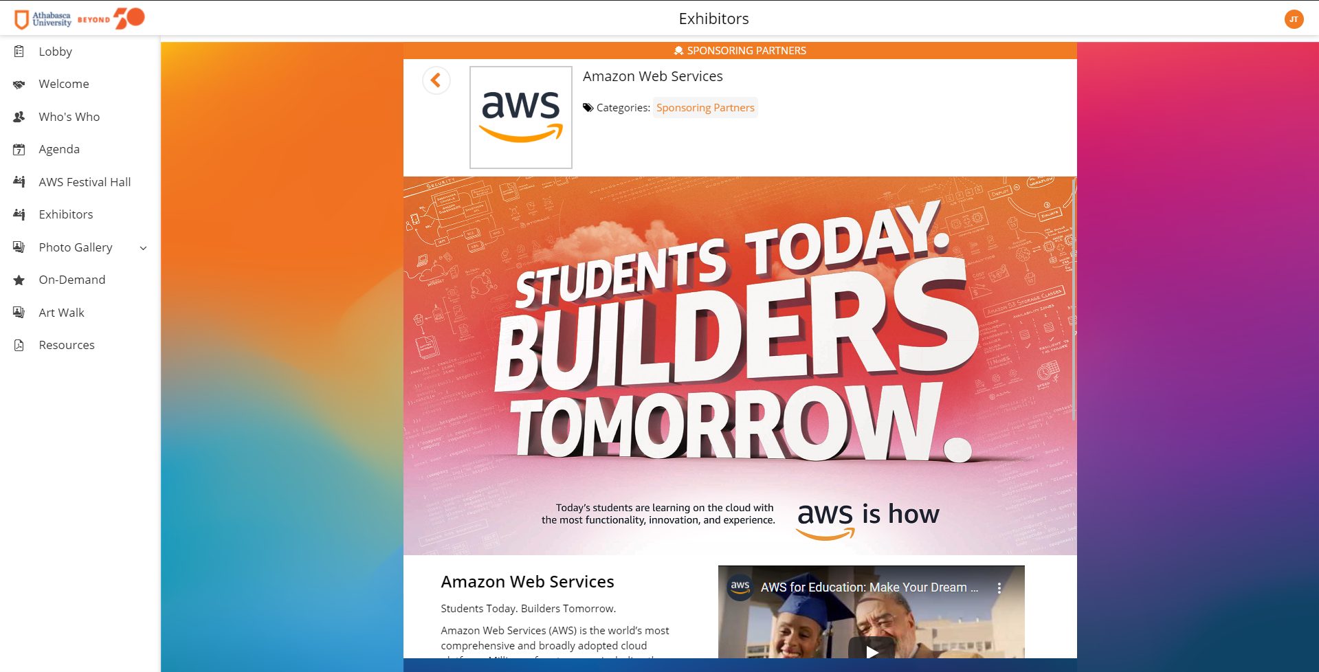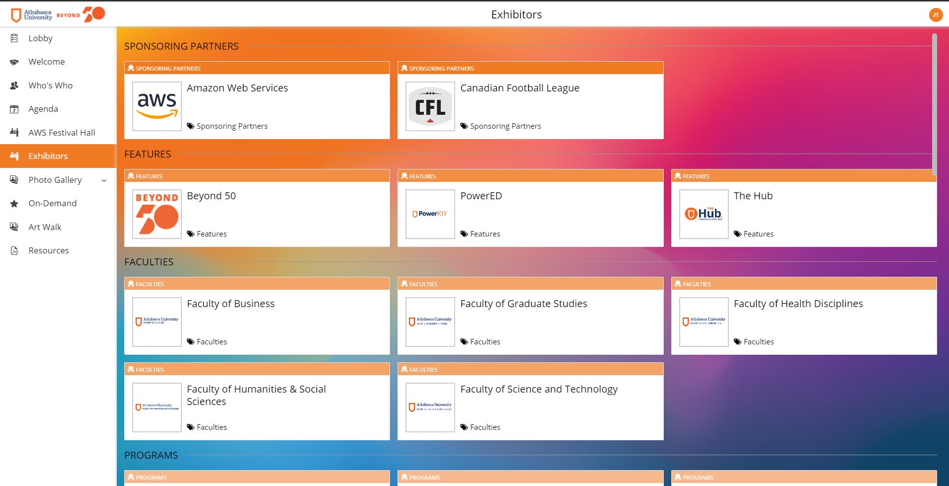 - Exhibitor page featuring sponsor partners and faculties