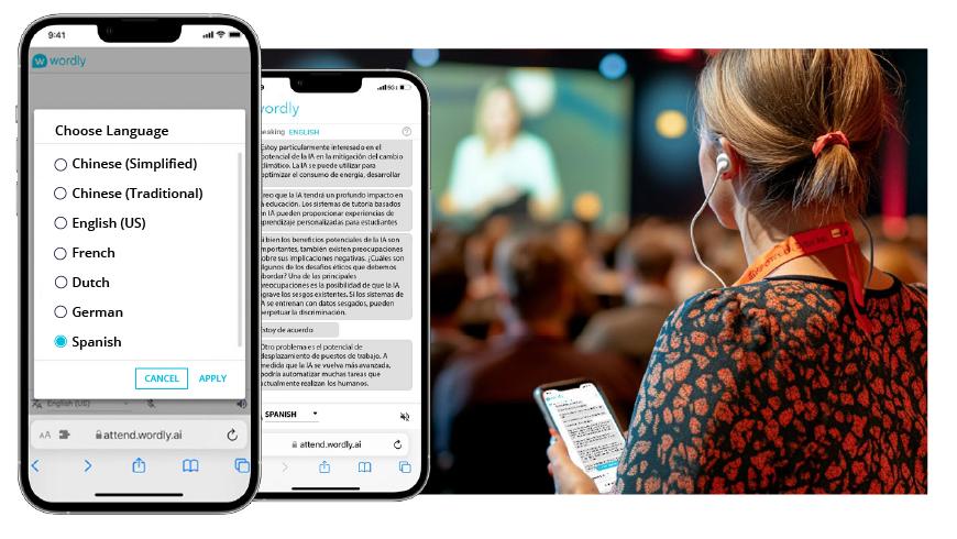 Les services de traduction basés sur l’IA d’Encore utilisent Wordly pour rendre vos événements plus inclusifs et accessibles en traduisant instantanément les discours dans plus de 50 langues via l’audio ou les sous-titres. Que vos invités soient multilingues ou malentendants, nos solutions intelligentes en temps réel garantissent que tout le monde demeure connecté et informé.